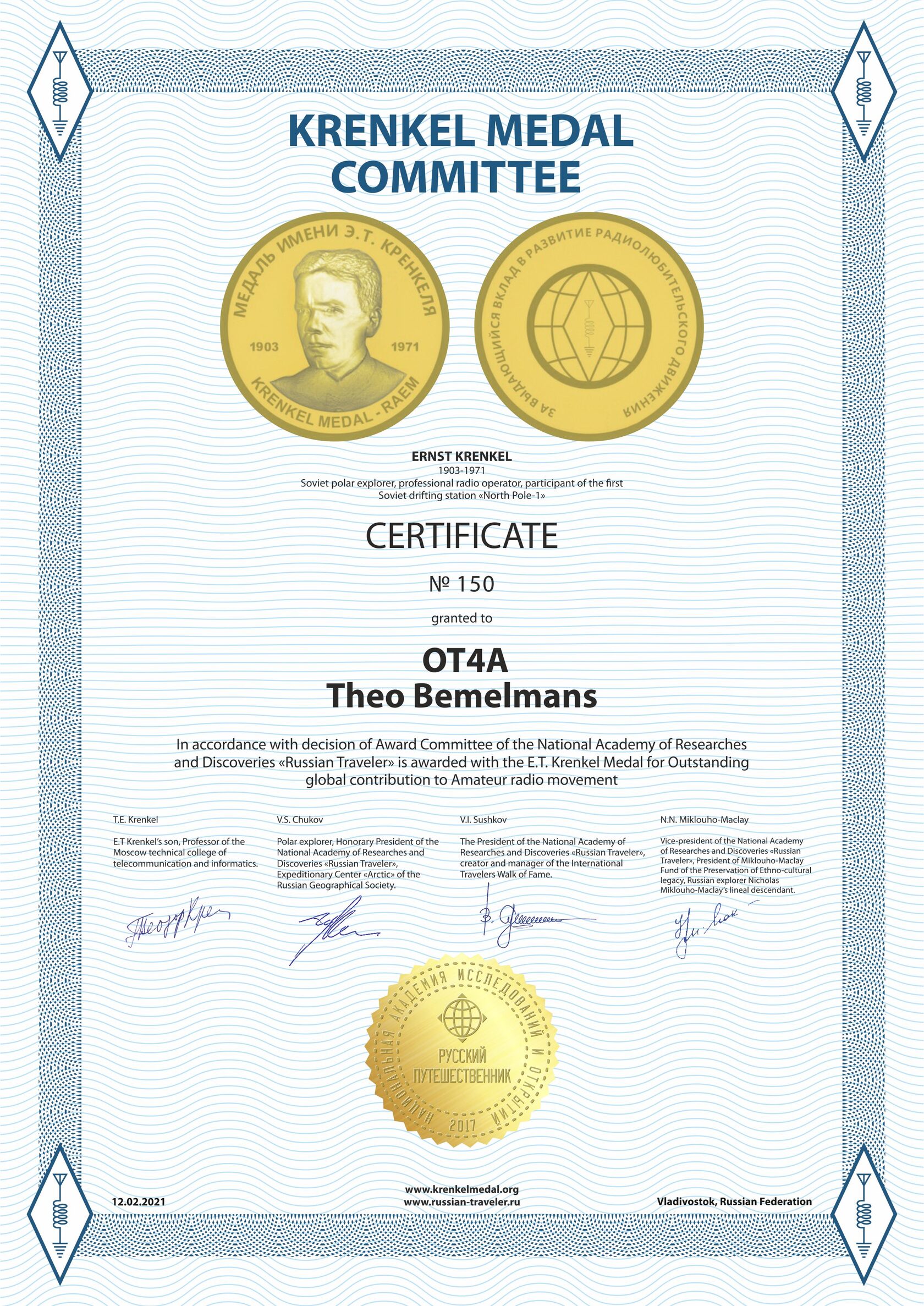 Эрнст Теодорович Кренкель является примером для подражания. Выдающийся радист-коротковолновик. Не каждому дано с честью и достоинством пройти жизненные испытания в нашей тогда суровой стране СССР - от славы Героя Советского Союза до запрещения заниматься любимым делом. Уникальная личность. Каждый, кому посчастливилось встретиться с ним, навсегда запомнит его обаяние, скрывающиеся на мужественном, закалённом полярными ветрами, лице, глаза с весёлыми искринками, густой бархатный голос. И каждый коротковолновик мира может засвидетельствовать ему своё почтение, включив трансивер и на простую проволочную «верёвку» пятью Ваттами провести радиосвязь телеграфом. Мы всегда слышим Ваш позывной RAEM! Для меня огромная честь стать обладателем такой очень уважаемой и почетной награды – медаль имени Э.Т. Кренкеля!